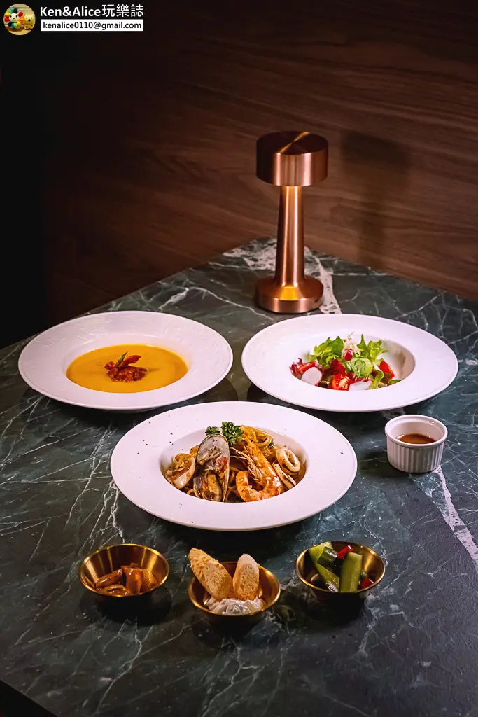 『海鮮義大利麵』的鮮蝦、透抽、淡菜釋放出大海的鹹鮮甘甜,在其他信義餐廳光這道主食,單點就要$380了吧。